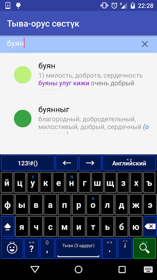 Чтобы успешно пользоваться словарем, рекомендуем скачать тувинскую раскладку клавиатуру «Тыва танал» — это позволит Вам набирать тувинские буквы из расширенной кириллицы «ӨҢҮ».