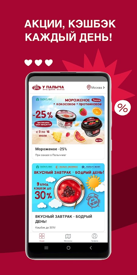 Полный доступ к лучшим предложениям на любимую продукцию, а также: индивидуальный статус в программе лояльности и удобная карта фирменных магазинов с адресами, телефонами и графиком работы