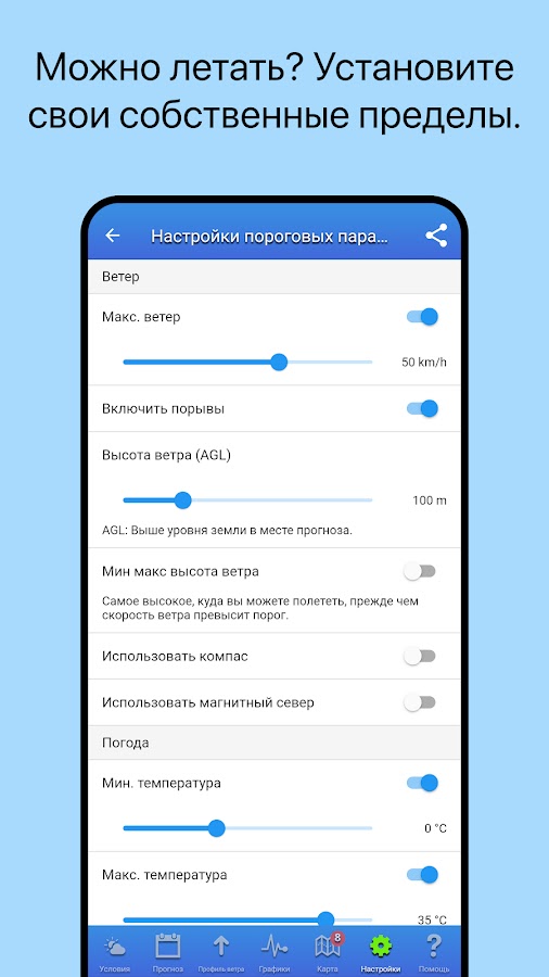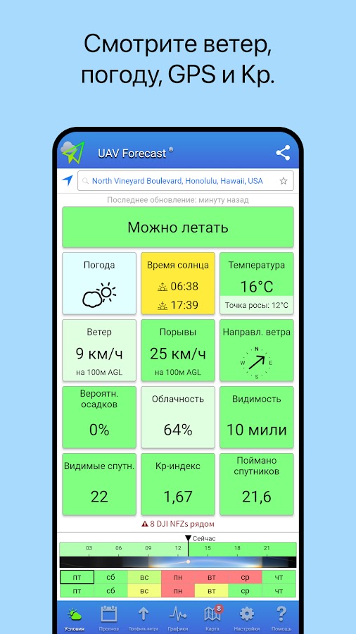 • Автоматический анализ условий с цветовой кодировкой: зеленый для Хорошо для полета, красный для Не подходит для полета.