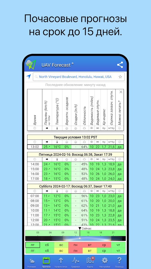 • Почасовые прогнозы до 15 дней.