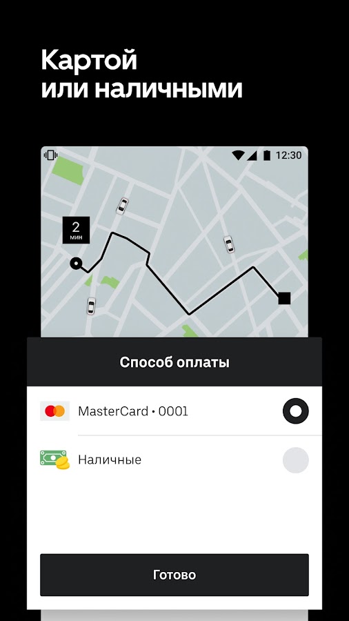 Оплачивайте поездки наличными или привязанной к приложению картой.