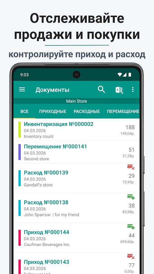 Вы можете оформлять документы прихода(покупки), расхода(продажи), инвентаризации и перемещения между складами.