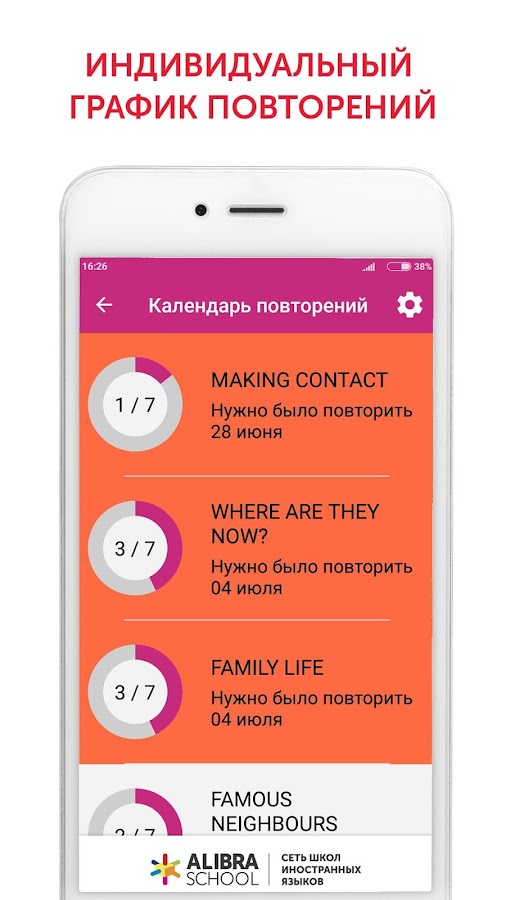 — уникальная методика 7-ми кратного интервального повторения, разработанная в ALIBRA SCHOOL, которая позволяет быстро выучить слова раз и навсегда;