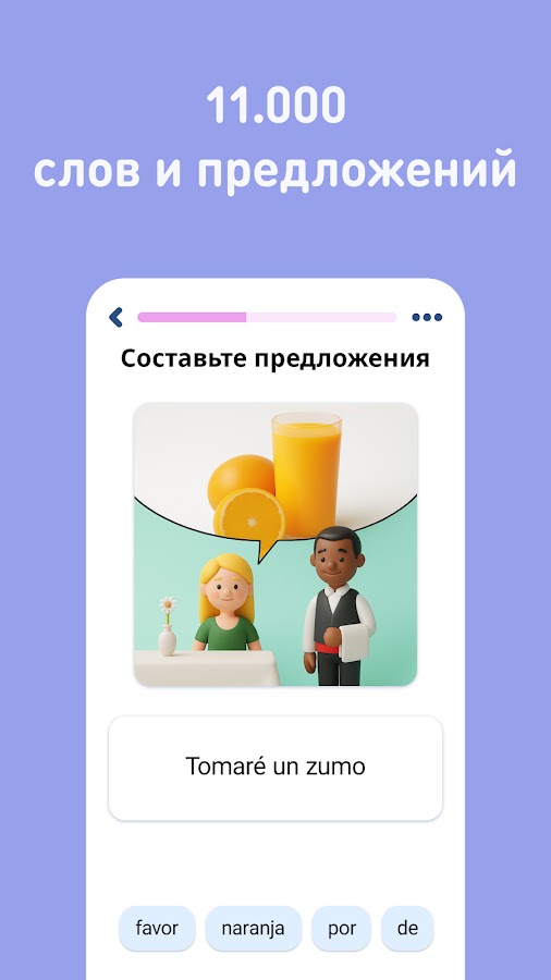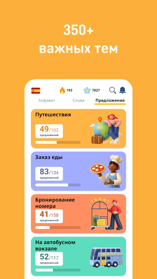 • 5.000 испанских фраз (часто используемые): самые важные фразы для ежедневных разговоров и путешествий, поделенные на 10 уровней и 120 тем.