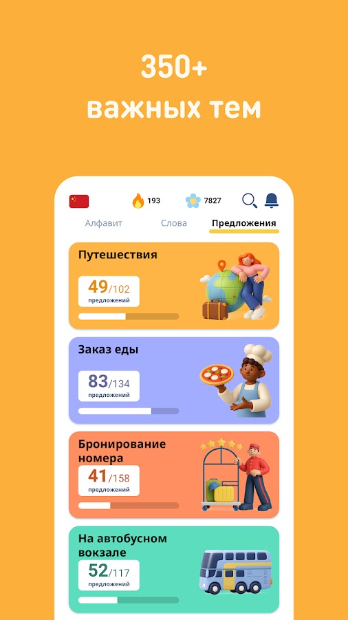 • 5.000 китайских фраз (часто используемые): самые важные фразы для ежедневных разговоров и путешествий, поделенные на 10 уровней и 120 тем.