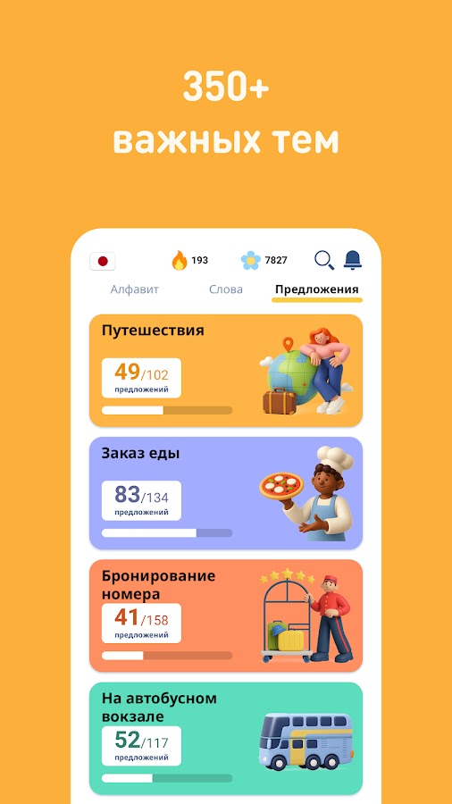 • 5.000 японских фраз (часто используемые): самые важные фразы для ежедневных разговоров и путешествий, поделенные на 10 уровней и 120 тем.