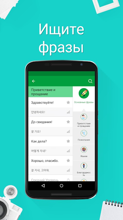 Благодаря приложению Учите корейский, теперь вы можете узнать более 5.000 фраз на корейском и использовать их в диалог, в то же время получая от этого истинное удовольствие! Независимо от того, являетесь ли вы туристом, который отдыхает в одной из стран, которая говорит на корейском или человеком, который всего лишь хочет общаться на иностранном языке, это приложение поможет вам учить фразы на корейском быстро, легко и весело.