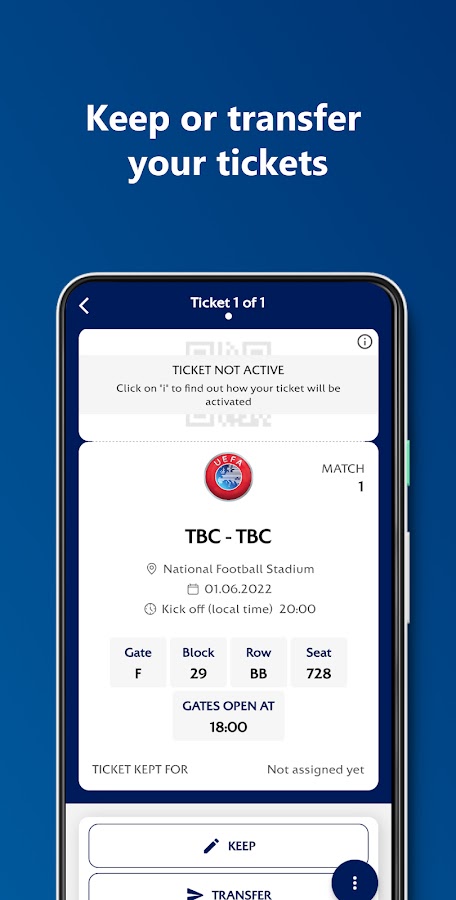 С помощью приложения UEFA Mobile Tickets болельщики, у которых есть билеты, могут безопасно загружать, передавать, хранить, назначать гостю билет в любое время и в любом месте на мобильном устройстве.