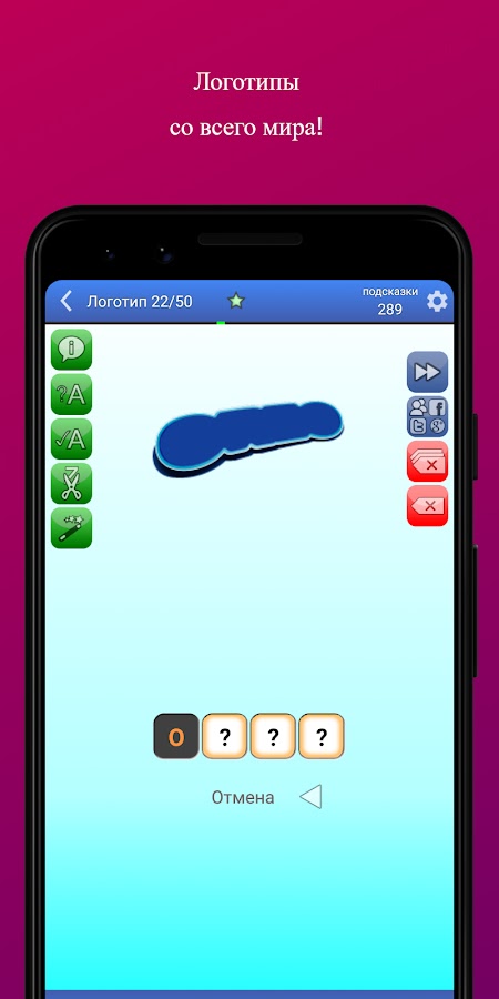 Превосходная игра на угадывание логотипов, которая доставит вам часы удовольствия и веселья! Играйте сами или вместе с друзьями. Не можете угадать? Воспользуйтесь подсказками, которые позволят вам продвинуться дальше на пути к более сложным вопросам. Разгадывайте логотипы. Угадывайте бренды. Выигрывайте призы.
