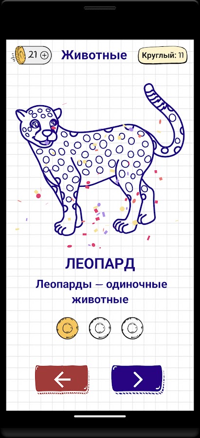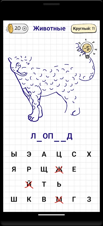 Угадав все буквы в слове, открывается полная картинка, и ребенок становится победителем. В зависимости от неправильных попыток монеты добавляются в игровой карман ребенка.