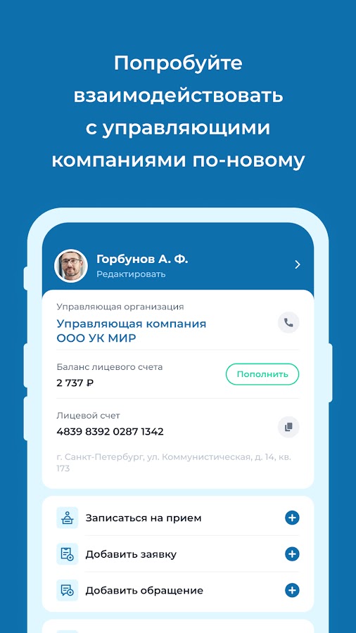 Приложение УК Мир — это личный кабинет для клиентов управляющей компании «Мир».