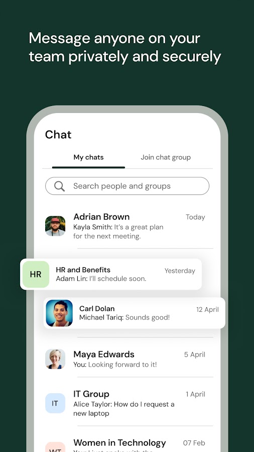 • Создавайте и присоединяйтесь к группам ресурсов сотрудников, посвященным работе, хобби, интересам и т. д.