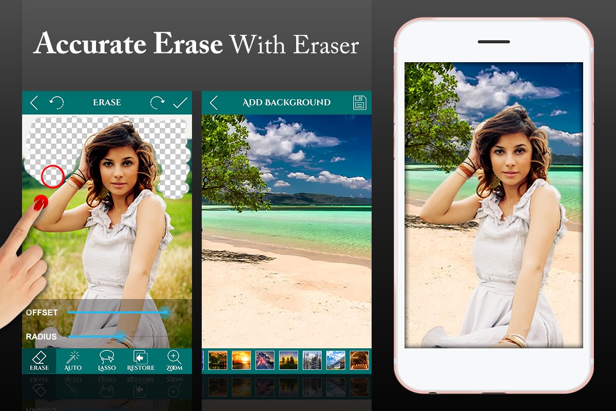 Окончательный Фоновый ластик обеспечивает быстрый и легкий способ изменить фотографии фона. Просто нажмите на область, которую вы хотите удалить, и автоматический ластик сделает остальную работу за вас. Вы также можете удалить ваши фотографии фона вручную нажатием пальца или с помощью Lasso (Image нарезка) инструмента.