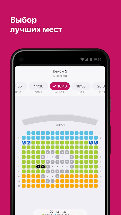 Наше приложение предоставляет схему зала с цветовой индикацией стоимости мест, чтобы вы могли выбрать подходящее для вас местоположение для просмотра.