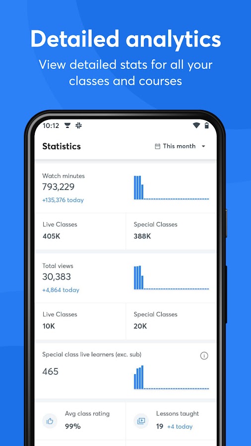 📊 Статистика: получайте подробную статистику о минутах просмотра, просмотрах, рейтингах, отзывах, посещаемости учащихся и многом другом. Узнайте, как учащиеся взаимодействуют с вашим контентом на платформе Unacademy.