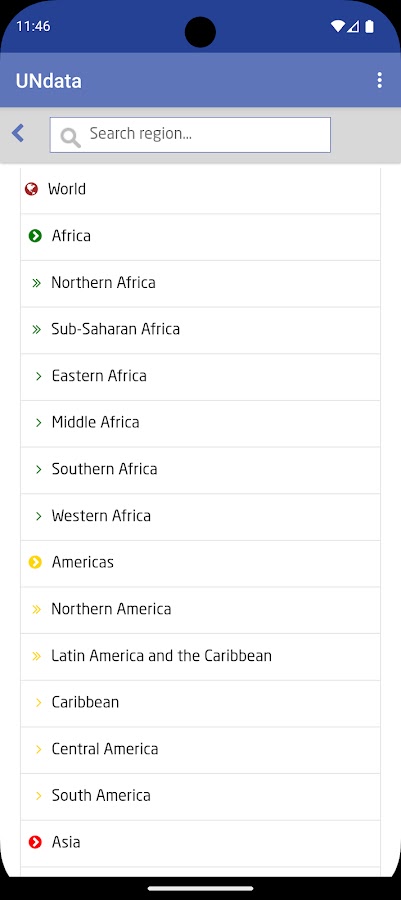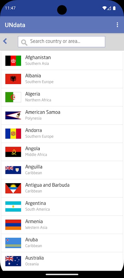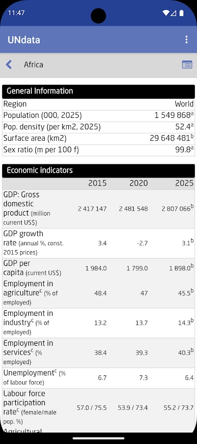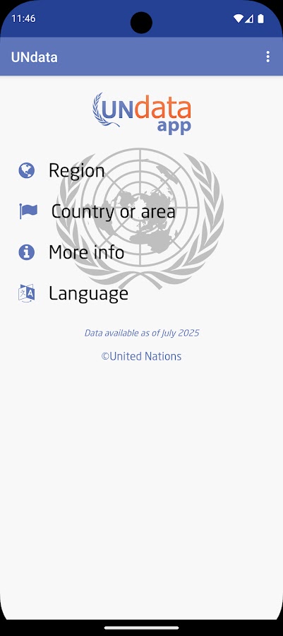 Приложение UNdata — это бесплатное приложение, разработанное Организацией Объединенных Наций, которое предоставляет пользователям портативный доступ к подборке ключевых статистических показателей, организованных в 4 раздела: общая информация, экономические показатели, социальные показатели, а также показатели окружающей среды и инфраструктуры. Информация представлена для 30 географических регионов и более чем 200 стран и регионов мира. Благодаря простому и удобному интерфейсу приложение позволяет пользователям быстро находить каждый профиль.