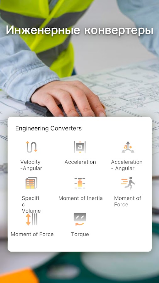 — Инженерные конвертеры: ускорение, плотность, удельный объем, момент инерции, момент силы, крутящий момент и др.