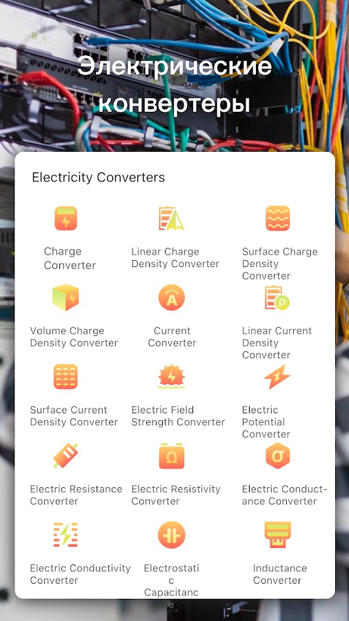 — Электрические конвертеры: заряд, ток, электрический потенциал, электрическое сопротивление, электропроводность, электростатическая емкость и др.