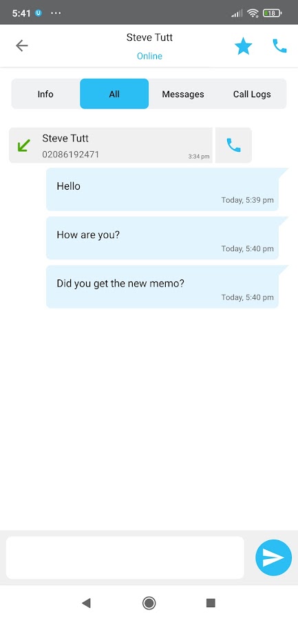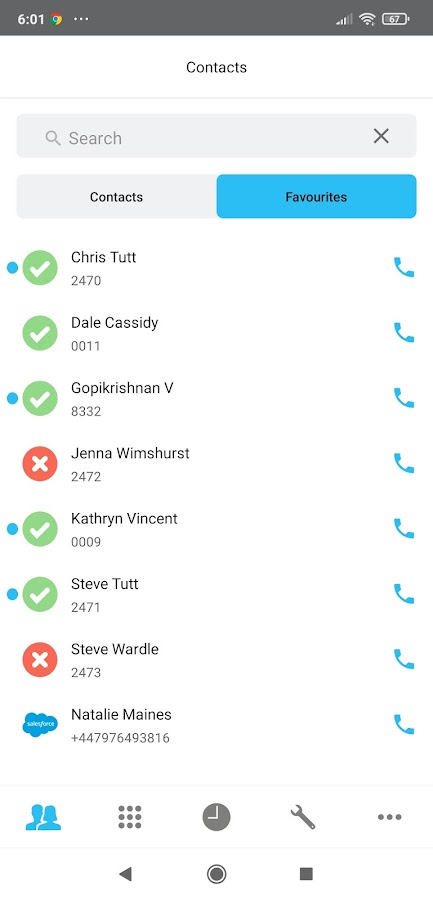 • Контакты: поиск групповых / корпоративных и личных контактов из BroadWorks, а также контактов, хранящихся на мобильном устройстве.