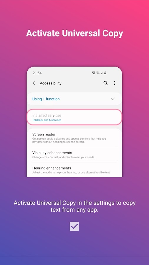 Это приложение использует службы специальных возможностей. (BIND_ACCESSIBILITY_SERVICE для доступа к тексту, отображаемому на экране, и возможности его копирования)