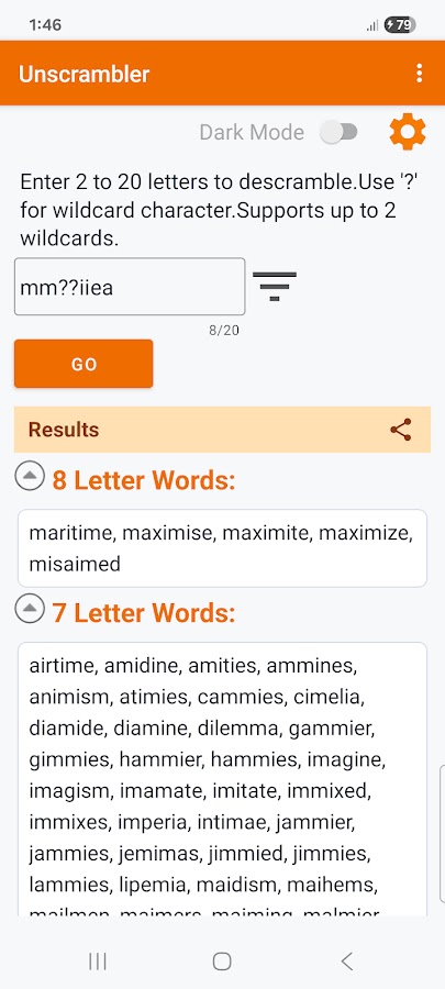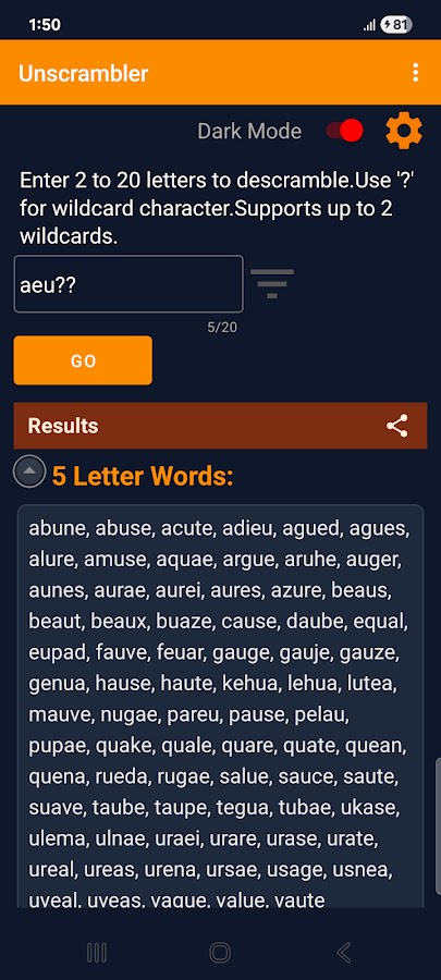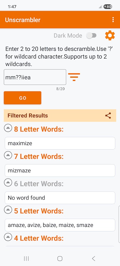 * Быстро находите слова с помощью этого приложения. Он поддерживает до 20 букв.