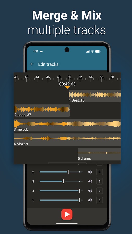 — Визуализация формы волны: легко перемещайтесь по аудио с помощью интуитивно понятного представления формы волны. Сведите пальцы и увеличьте масштаб для точного редактирования и размещения точек петли.