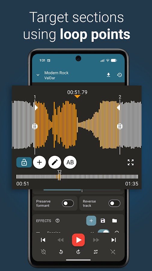 — Music Looper: отрабатывайте сложные отрывки с точным зацикливанием. Установите точные точки цикла и сохраните настройки для будущих сеансов.