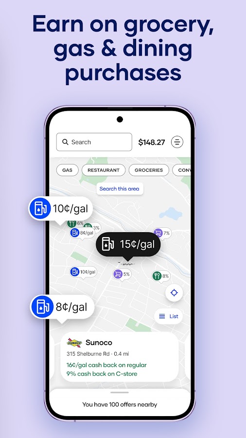 — Заправочные станции: смотрите цены на бензин и получайте вознаграждение за топливо — возврат до 25 центов за галлон за бензин на более чем 100 000 заправочных станциях по всей территории США (включая все крупные бренды, такие как Shell, Valero, BP, Phillips 66, Circle K, Speedway, 76, Racetrac, Conoco, Mobil и Exxon).