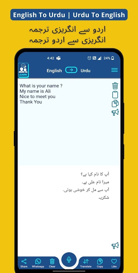 С помощью этого классного приложения вы можете печатать на урду и переводить урду на английский. Это приложение предоставляет функцию произношения для прослушивания переведенного текста на разной высоте, чтобы вы могли четко понимать произносимые слова. Вы можете очень легко скопировать и поделиться переведенным текстом в любом приложении для обмена сообщениями, чата или социальных сетей.