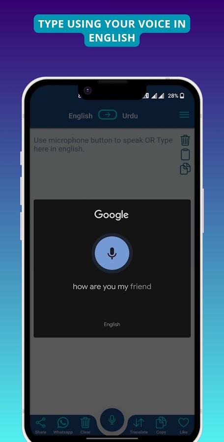 Используя кнопку переключения вверху, вы также можете вводить текст на английском языке. Это делает набор текста на английском языке естественным. Когда вы вводите символ урду, он автоматически переводится на английский алфавит. Когда вы нажмете пробел, в нижней части экрана появится больше слов, содержащих дополнительные варианты, соответствующие только что набранному вами слову. Вы можете печатать на английском языке, используя буквы урду, так, как вы на них говорите. Как только вы закончите печатать на английском языке, вы можете использовать кнопку перевода внизу, чтобы перевести тексты с английского на урду.