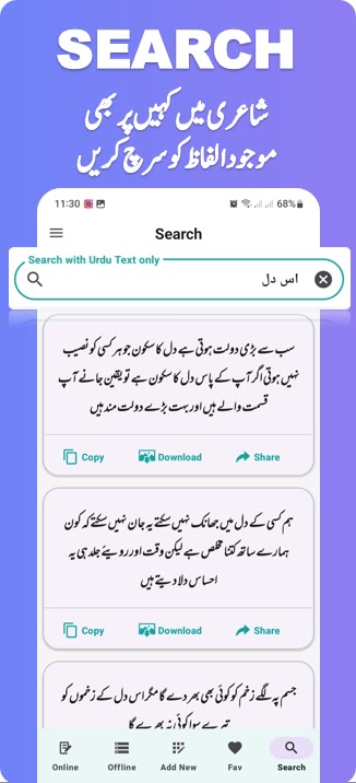 Скачайте приложение «Статусы с урдуской поэзией и шайари» — офлайн/онлайн, исламские, грустные, любовные SMS — сегодня и начните делиться своими чувствами. Будь то сабар (чувство грусти), дуа (молитва) или ишк (любовь), лучшие стихи на урду вы найдете прямо здесь.