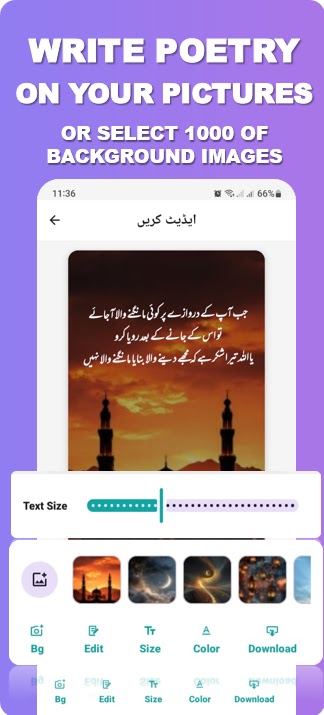 Редактор стихов на фото: Выберите любой пост, отредактируйте фоновое изображение с помощью красивых дизайнов и загрузите его в свою галерею.
