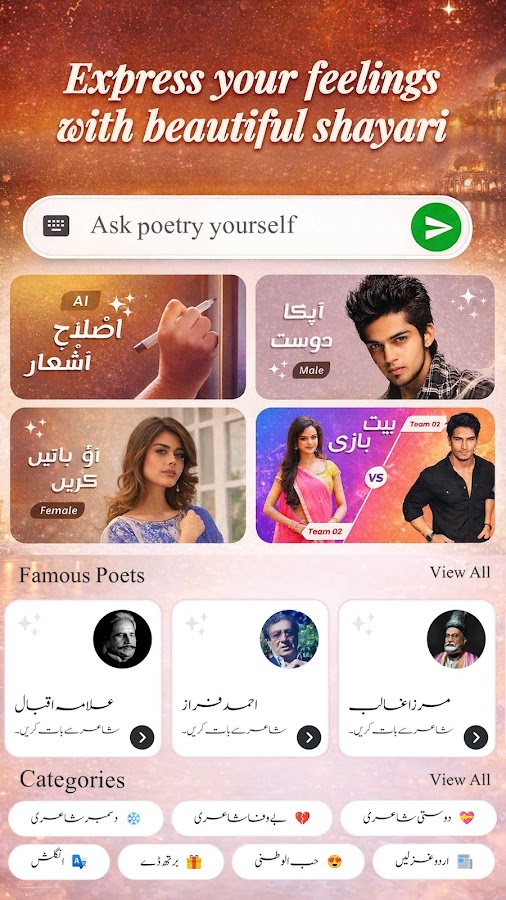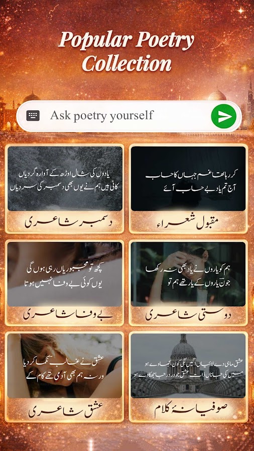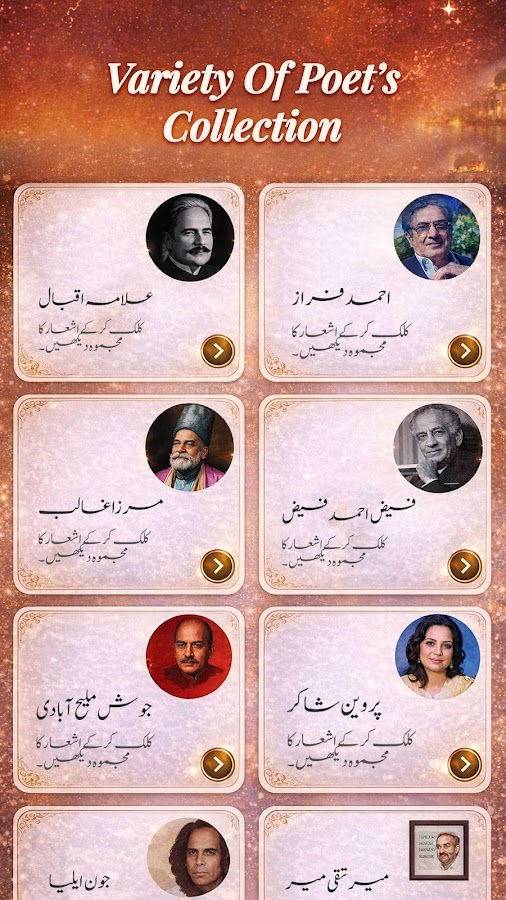 Идеально подходит для любых эмоций Выражайте свои чувства с помощью грустной поэзии для разбитого сердца, любовных шаяри для романтики или Naat Kalaam для духовной преданности. Независимо от того, создаете ли вы дости шаяри для друзей или газели Ghamgeen для глубоких эмоций, это приложение станет вашим творческим компаньоном. Идеально подходит для любителей поэзии в Пакистане и за его пределами, это лучший способ поделиться своим сердцем в социальных сетях.