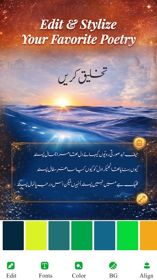 — Создавайте с легкостью: выберите фотографию, напишите стихи на урду и настройте их с помощью красивых шрифтов и цветов.