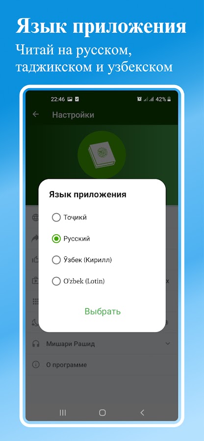 Барномаи Қуръони Карим аз 114 сура иборат мебошад, барои хондан хеле қулай аст ва реҷаи шабона ва рузона низ мавҷуд мебошад. Барнома бо навиштаҷоти арабӣ, транскрипсияи кириллӣ ва тарҷумаи тоҷикӣ, русӣ, узебкӣ кириллӣ ва узебкӣ лотинӣ пешниҳод карда шуд. Навиштаҷотҳоро калону хурд ва айёну ноаяйён кардан мумкин аст. Сураи писандидаро бо рӯйхати писандидаҳо низ дохил кардан мумкин аст. Позитсияи охирин дар хондан дар барнома сабт карда мешавад.
