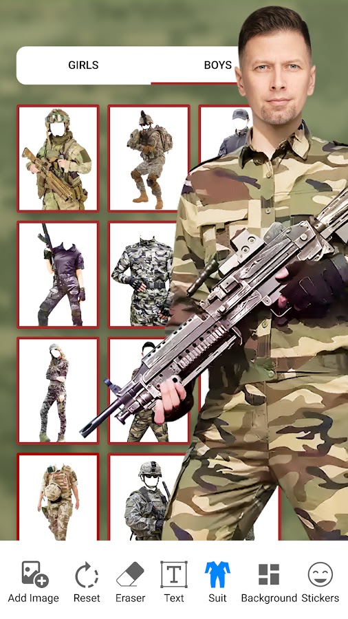 Теперь сделайте селфи в армейской одежде и обрежьте фон, чтобы сделать изображение прозрачным. Военные костюмы всегда привлекают людей и особенно офицерская форма. Таким образом, приложение для создания армейских костюмов позволяет вам носить костюмы коммандос, военно-морскую форму, особенно в день независимости 14 августа или в день обороны.