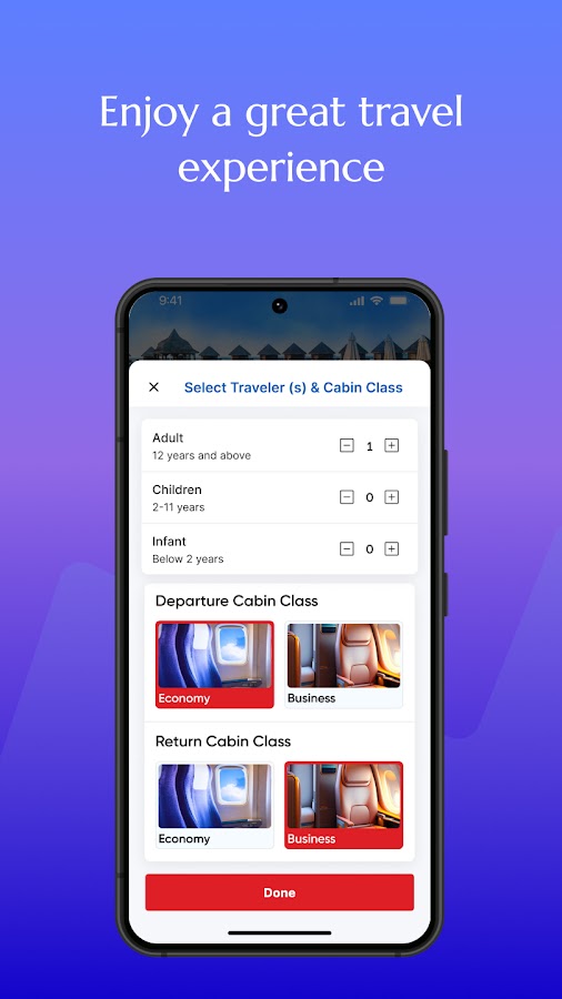 Через наше мобильное приложение вы получите доступ к эксклюзивным предложениям на авиабилеты, скидкам на туристические пакеты и непревзойденным предложениям на рейсы по популярным направлениям. Просматривайте специальные тарифы и открывайте для себя удивительные предложения, специально разработанные как для внутренних, так и для международных рейсов, доступные только в приложении.