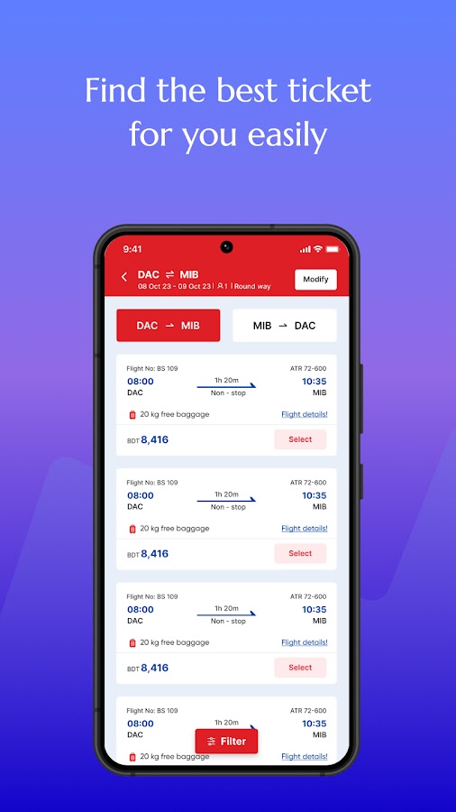 Бронируйте авиабилеты, регистрируйтесь и открывайте для себя потрясающие туристические предложения! Уделяя особое внимание удовлетворенности клиентов, надежному обслуживанию и доступным тарифам, US-Bangla Airlines станет вашим лучшим спутником в путешествиях. Приготовьтесь к удобному путешествию: загрузите приложение US-Bangla Airlines и начните свое путешествие сегодня.