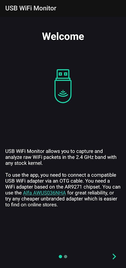 ВАЖНО для этого приложения требуется USB-адаптер WiFi с чипсетом AR9271, подключенный к вашему устройству Android через USB-кабель OTG. Более подробную информацию см. ниже.
