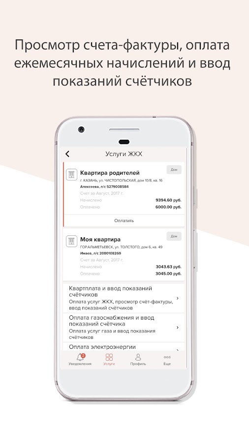 Оплата услуг ЖКХ, просмотр счёт-фактуры, ввод показаний счетчиков;