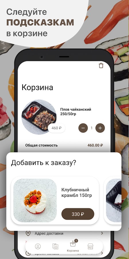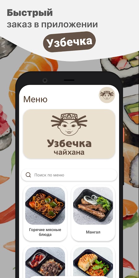 Как сделать заказ в приложении “Узбечка”: выберите понравившиеся позиции из меню, добавьте их в корзину и перейдите на экран оформления заказа (по нажатию на иконку корзины).
