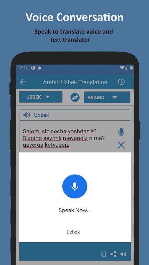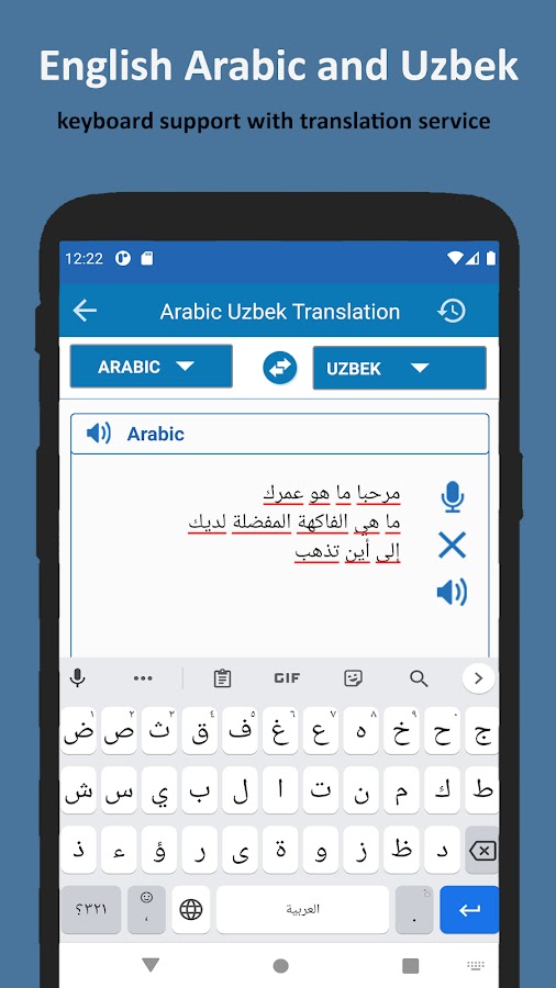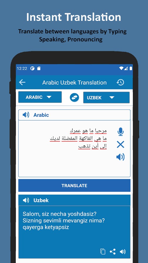 Переводчик с узбекского на арабский язык совершенно бесплатен для всех пользователей. Вы можете переводить целые абзацы с узбекского на арабский и с арабского на узбекский язык. Приложение «Переводчик с узбекского на арабский» — лучший способ быстро переводить тексты на вашем мобильном телефоне или планшете.