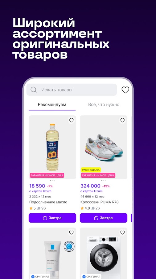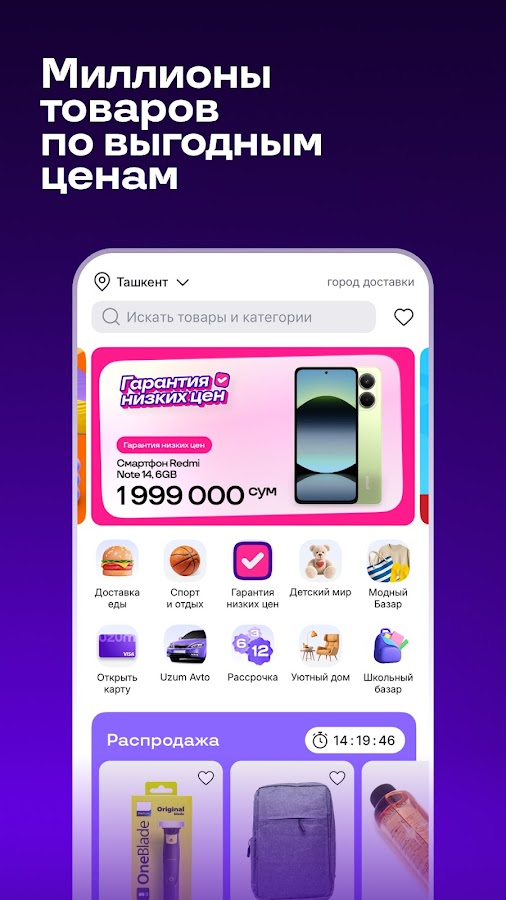 💜Выгодные покупки уже ждут вас в Uzum Market. Всё необходимое в одном приложении: электроника и бытовая техника, одежда, обувь и аксессуары, товары для красоты и ухода, товары для здоровья, товары для дома, товары для строительства и ремонта, автотовары, детские товары, всё для хобби и творчества, товары спорта и отдыха, продукты питания, бытовая химия, канцтовары, зоотовары, книги, товары для дачи, сада и огорода, быстрая доставка еды из магазинов и ресторанов.