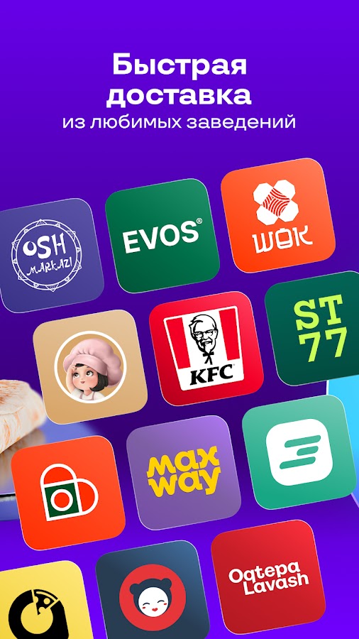 В приложении доступна доставка еды из KFC, EVOS, Oqtepa Lavash, Max Way, Yaponamama, Bon!, Les Ailes, WOK, Street 77 и сотен других ресторанов. Хотите плов, пиццу, суши или бургеры? Любая кухня — в одном приложении с быстрой доставкой на дом.