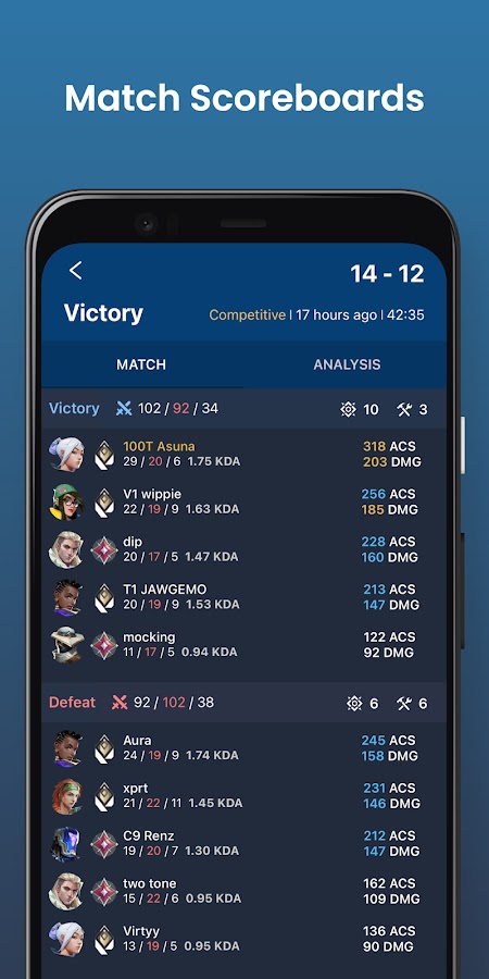 Вы можете просматривать информацию обо всех игроках Valorant, у которых открыт профиль. Добавьте любимых игроков, чтобы следить за их статистикой. Вам также доступная информация обо всех матчах.