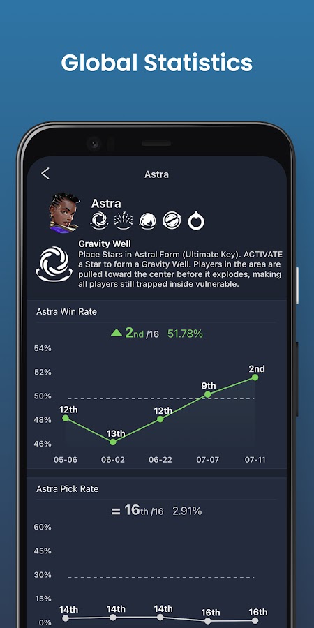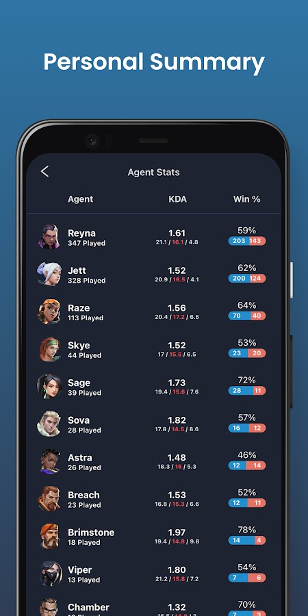 Узнайте о достижениях каждого агента Valorant. Просматривайте подробную информацию о каждом игроке, например его результаты KDA или процент побед.