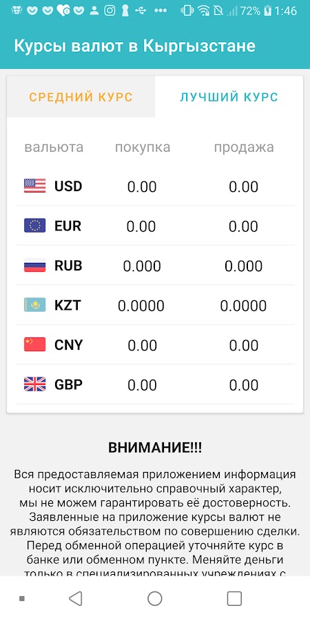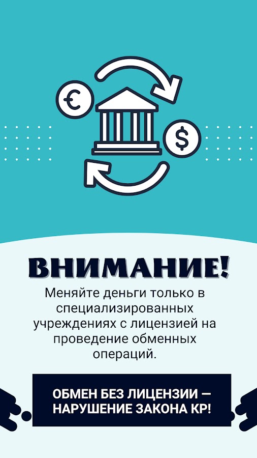 При размещении курсов используется только общедоступная информация, находящаяся в открытом доступе. Вся предоставляемая приложением информация носит исключительно справочный характер, мы не можем гарантировать её достоверность. Заявленные на приложение курсы валют не являются обязательством по совершению сделки. Перед обменной операцией уточняйте курс в банке или обменном пункте. Меняйте деньги только в специализированных учреждениях с лицензией на проведение обменных операций. В том случае, если размещенные курсы на нашем приложение не соответствуют действительности, администрация ответственности не несет. Информационные данные получены с сайта » Valuta.kg «. Веб-ресурс valuta.kg — бесплатный информационный агрегатор курсов валют банков и обменных бюро города Бишкек.