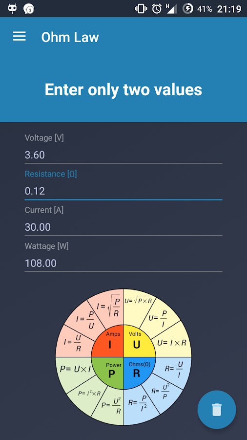 Калькулятор Закона Ома: Основан на законе Ома, Вы сможете рассчитать Напряжение [V], Сопративление [Ω], Слилу тока [A], Мощность [W]