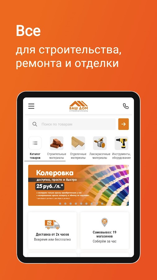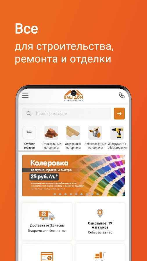 Мобильное приложение Ваш Дом — это заказ стройматериалов в Ростове-на-Дону, Аксае и Батайске. В сети строительных магазинов Ваш Дом вы найдете более 30 000 товаров для строительства, ремонта, отделки, сада и дачи по выгодным ценам с быстрой доставкой.