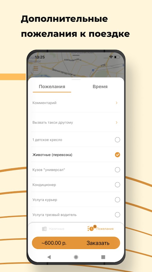 Добавляйте специальные опции из списка в приложении такси ВАШЕ, чтобы сделать вашу поездку еще более удобной. После создания заказа их можно будет отредактировать.